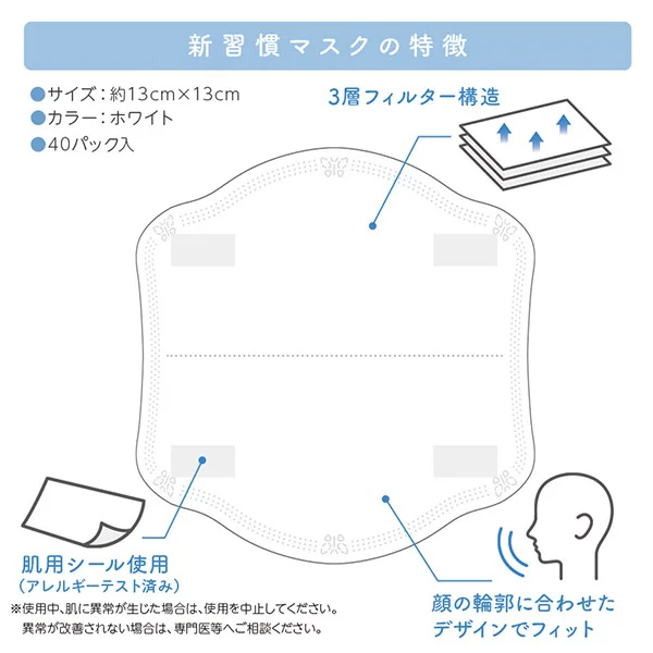 理美容室などで施術時に装着したままでも邪魔にならない「耳にかけない」お客様用マスク。ただの不織布マスクではなく、BFE(細菌ろ過効率)99%、PFE(微粒子ろ過効率)95%の本格派。しかも個包装で40パック入っており衛生的になってます。