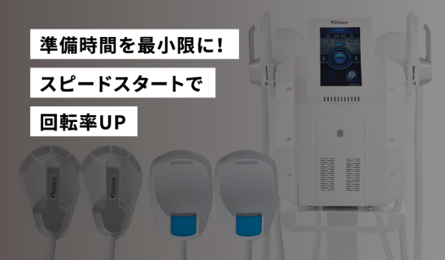 プローブの付け替えが一切不要で、巻くだけ・当てるだけで4か所同時に施術がスタートできます。また、ジェル、クリームなどは一切使用せず、本体1つで完結します。