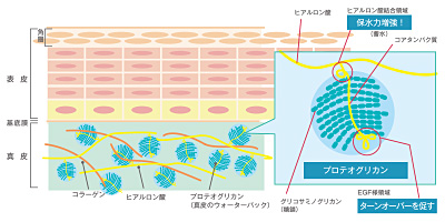 プロテオグリカンはもともと人間の皮膚に存在する「皮膚の保湿」や「肌を元気にする」などの働きをする成分です。保湿力が高くハリやうるおいをサポートします。
