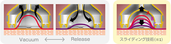 | バキューム減圧 (スーパーパルス) | 650mmHgと15Hzの強弱ある吸引で、エステティシャンの動きを再現。 特許技術のスライディング技術※1により、ハンドピースをスライドさせながら吸引が行えます。 |