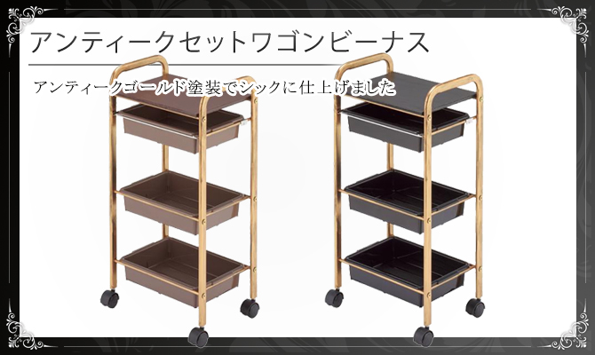 フレームは、アンティークゴールド塗装でシックに仕上げたセットワゴンです。木製天板はアンティーク調塗装仕上げ。キャスターは床に優しいウレタンタイヤ。※引き出しパット1段、固定パット2段。